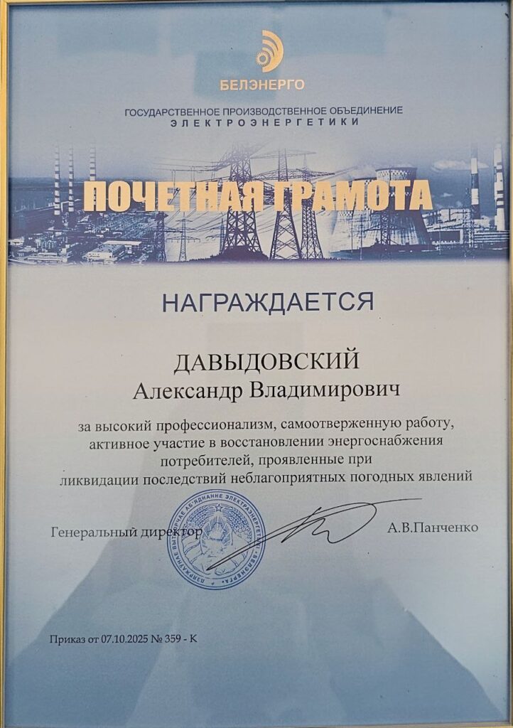 За высокий профессионализм, самоотверженную работу и активное участие в восстановлении электроснабжения потребителей при ликвидации последствий неблагоприятных погодных явлений Александру Давыдовскому вручена Почетная грамота ГПО «Белэнерго».