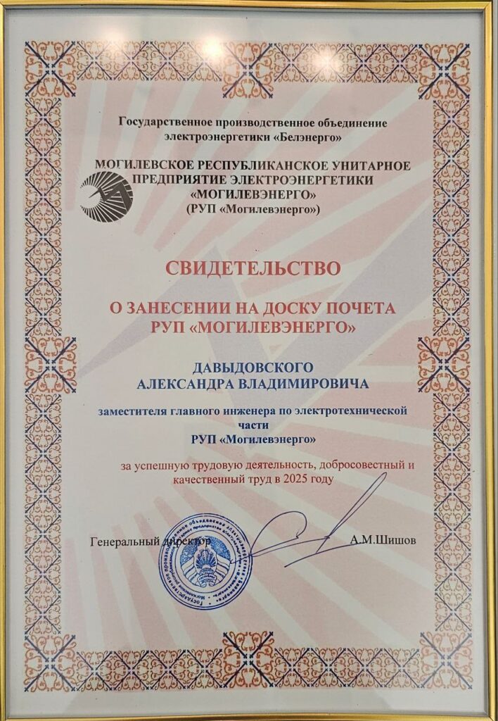 Торжественное вручение наград состоялось сегодня. Почетную грамоту и свидетельство о занесении на Доску почета Александру Давыдовскому вручил первый заместитель генерального директора — главный инженер РУП «Могилевэнерго» Александр Шишов.