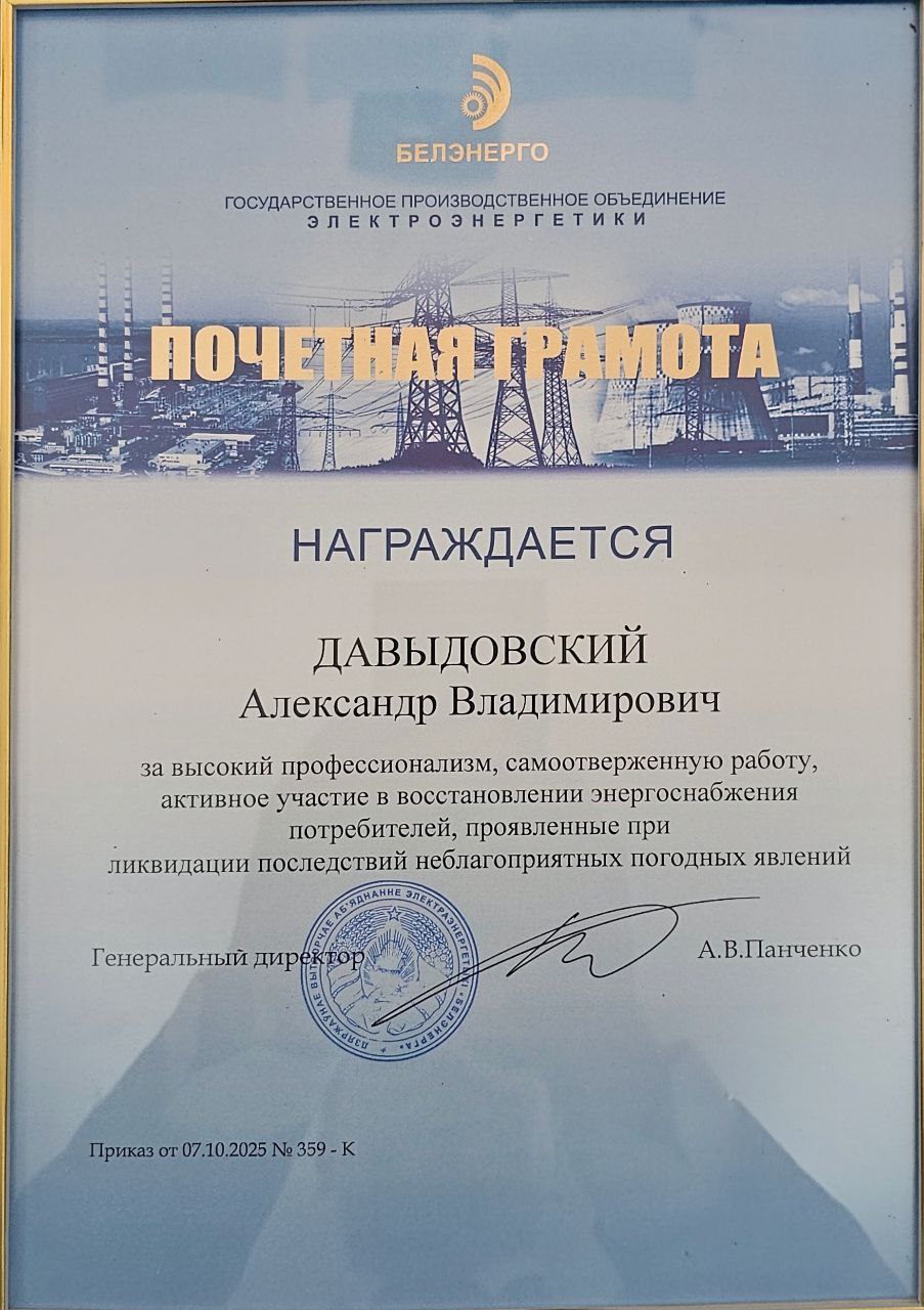 За высокий профессионализм, самоотверженную работу и активное участие в восстановлении электроснабжения потребителей при ликвидации последствий неблагоприятных погодных явлений Александру Давыдовскому вручена Почетная грамота ГПО «Белэнерго».