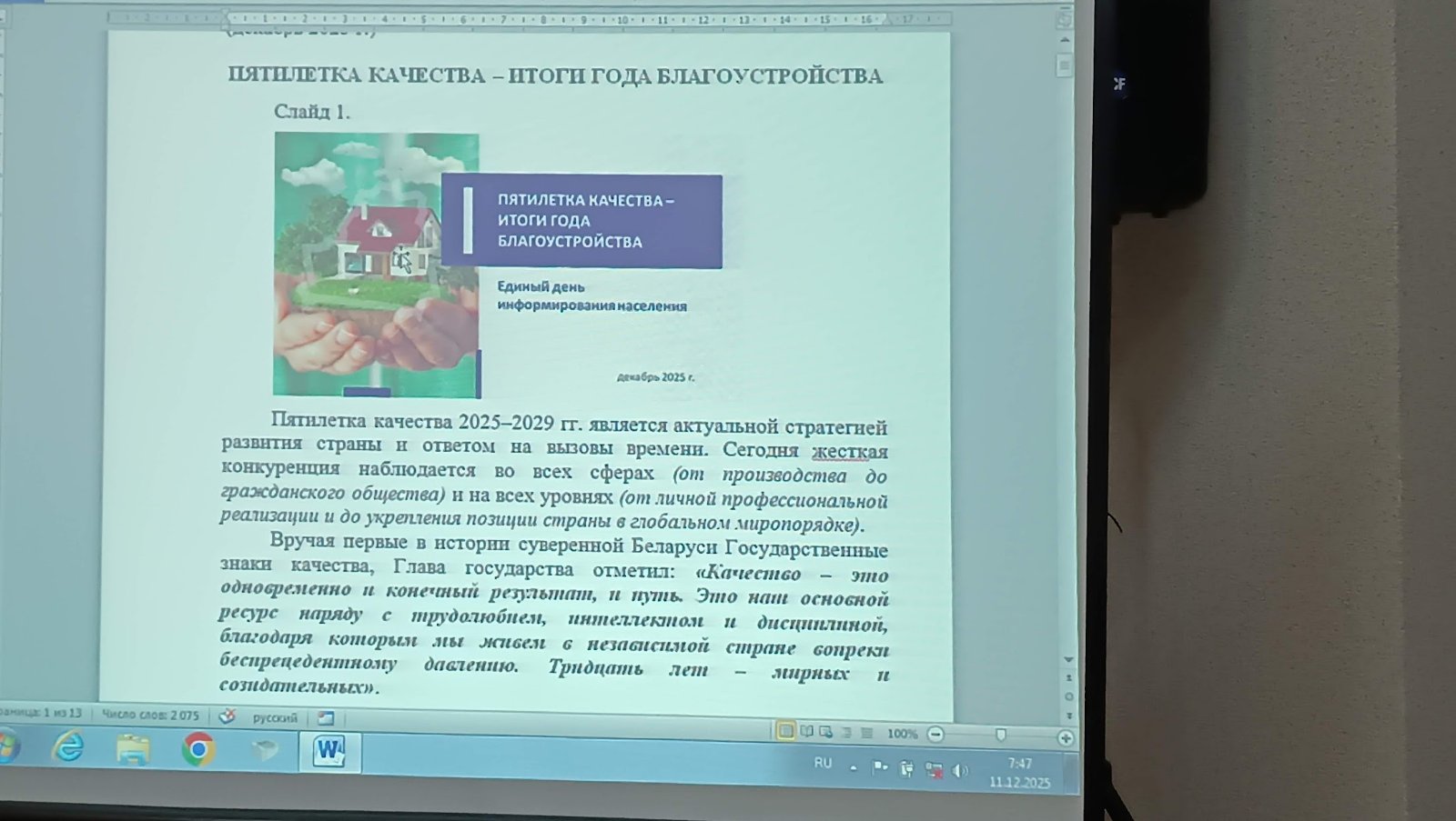 В филиале «Климовичские электрические сети» прошел Единый день информирования, посвященный актуальной теме — «Пятилетка качества: итоги Года благоустройства». Мероприятие стало важной площадкой для обсуждения результатов проделанной работы, значимых проектов и дальнейших задач в рамках реализации государственной программы.