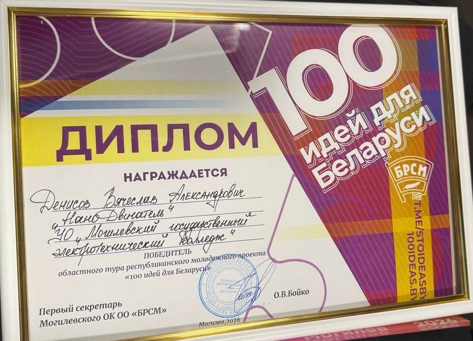 Учащийся Могилевского государственного электротехнического колледжа Вячеслав Денисов — победитель областного тура республиканского молодежного проекта «100 идей для Беларуси» в номинации «Энергетика, атомная энергетика, в том числе энергоэффективность».