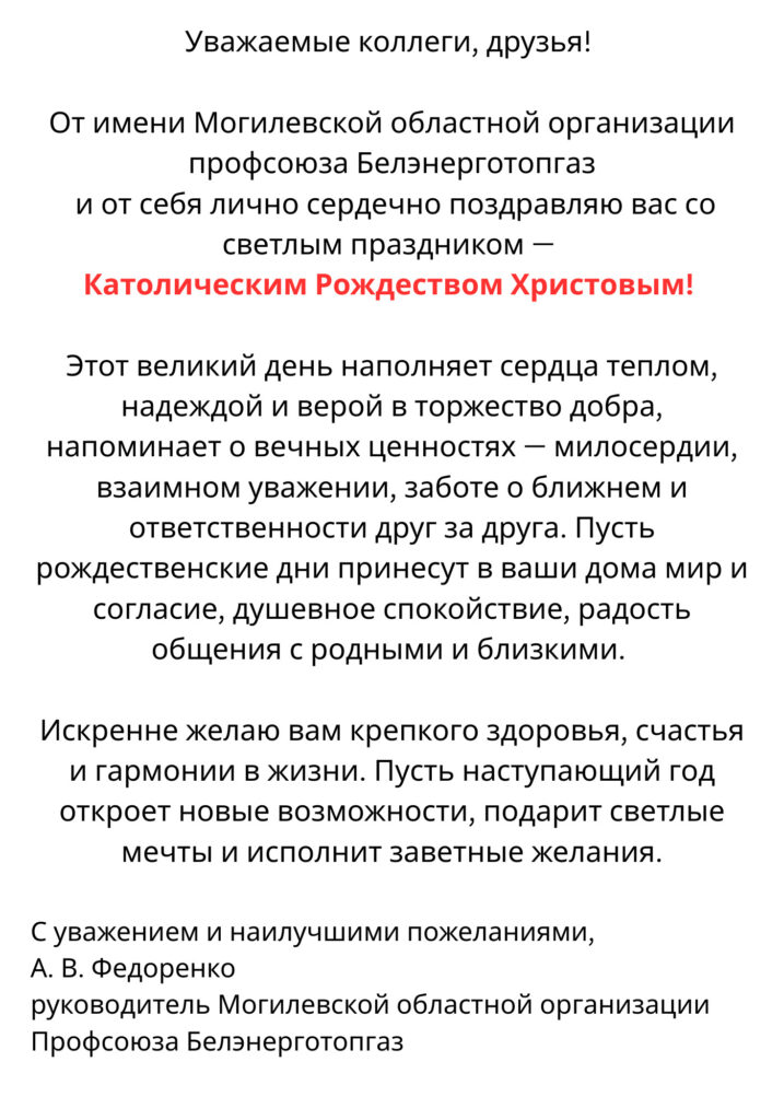 Главная / Новости / Поздравление с Католическим Рождеством от руководителя Могилевской областной организации Профсоюза Белэнерготопгаз Алексея Федоренко
