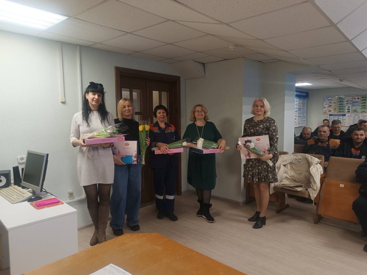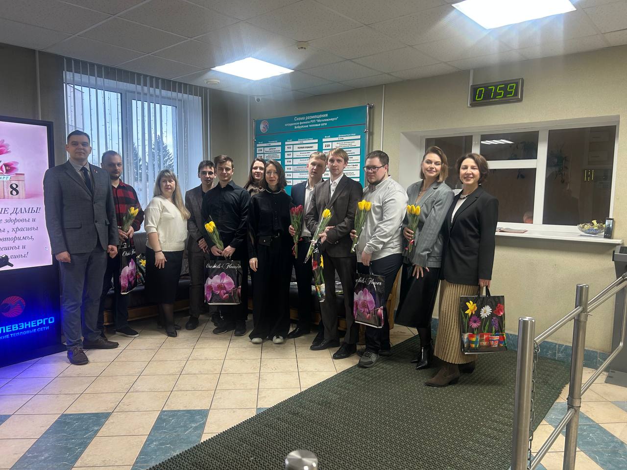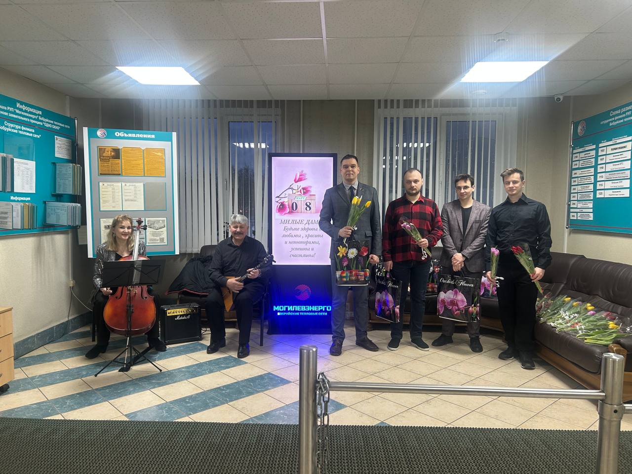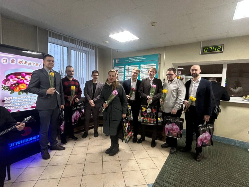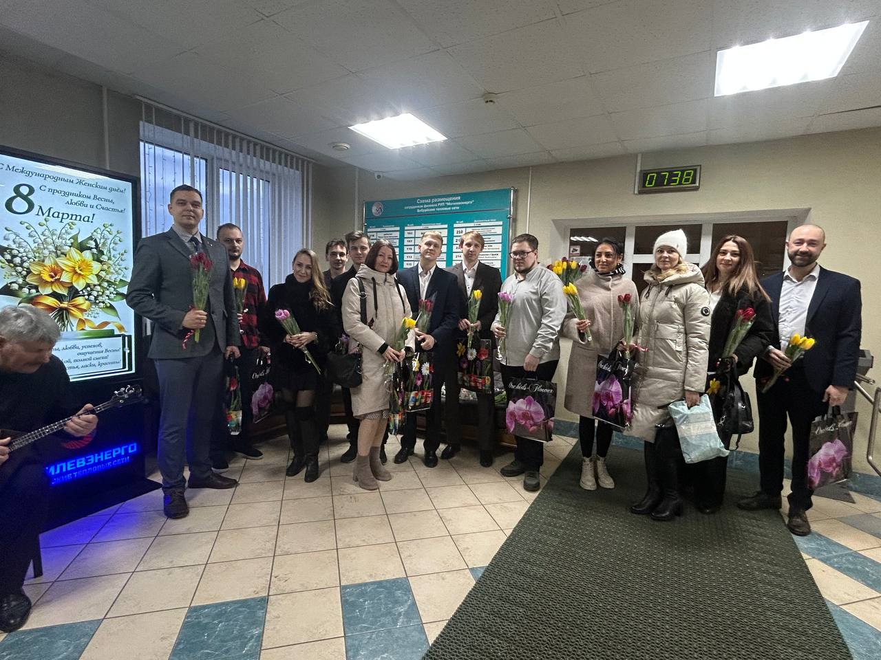 Но на этом сюрпризы не закончились. В фойе филиала женщин встречали их коллеги-мужчины. Здесь звучала живая музыка, создавая особую, по-настоящему праздничную атмосферу. Каждую представительницу прекрасной половины коллектива мужчины встречали с улыбками, вручали цветы и подарки, говорили искренние поздравления и добрые пожелания.