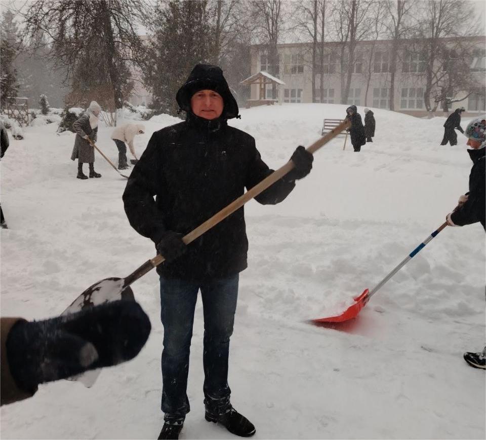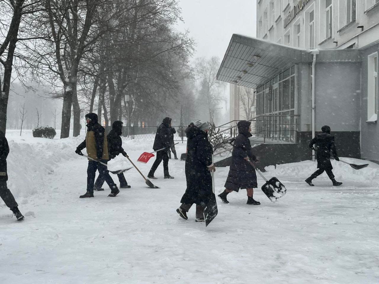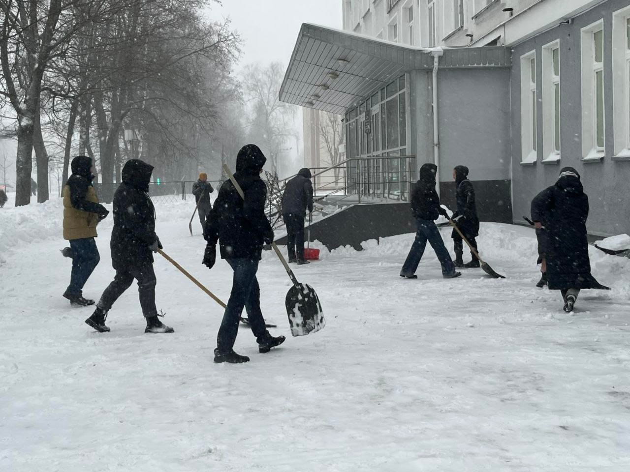 С самого утра, несмотря на сильный снегопад, коллектив колледжа вышел на уборку территорий. Вооружившись лопатами, преподаватели и студенты активно приступили к расчистке пешеходных дорожек, подъездных путей и площадок возле зданий колледжа.
