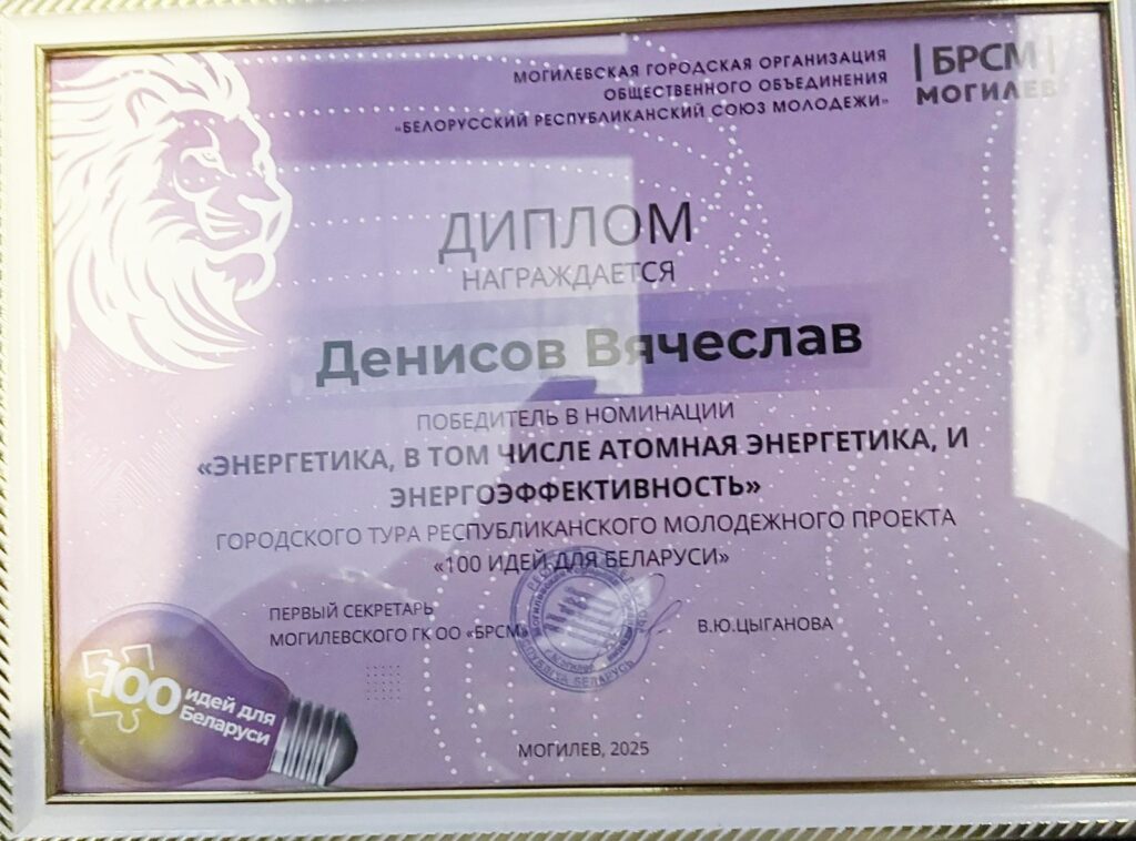На городском этапе конкурса Вячеслав завоевал диплом победителя в номинации «Энергетика, атомная энергетика, в том числе энергоэффективность». Представленный проект получил высокую оценку экспертной комиссии за актуальность, практическую значимость и ориентированность на развитие энергетической отрасли.