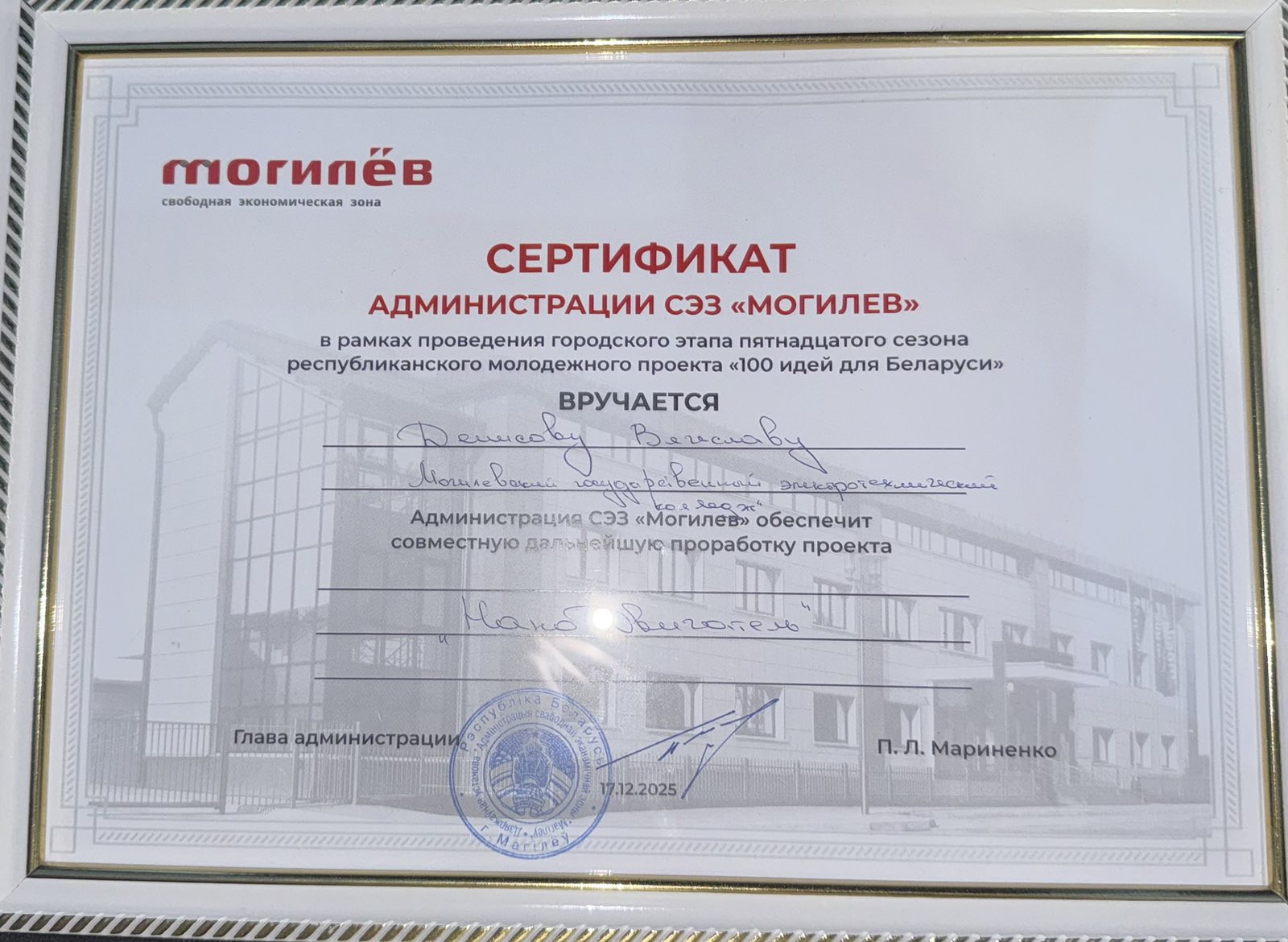 Учащийся Могилевского электротехнического колледжа вновь стал победителем проекта «100 идей для Беларуси»